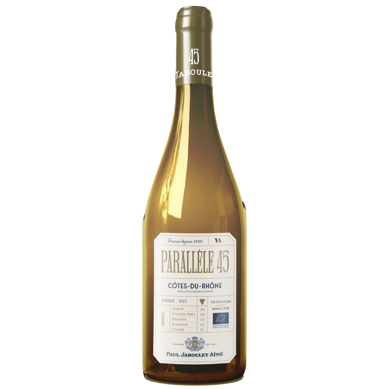Parallèle 45 on üks kõige klassikalisemad Rhône’i oru veine, seda tehakse juba 50ndatest alates, punane on muidugi hulga tuntum kui valge. Veini saadab pikk edulugu, Parallèle 45 müüakse üle maailma. Oma brändituntuse poolest võistleb ta söakalt hilisemate tulijate Uue Maailma kommertsveini brändidega. Vein sai nime Paul Jaboulet Aîné veinimajast kahe kilomeetri kaugusel asetseval 45nda põhja laiuskraadi järgi. See laiuskraad tähistab ametlikult piiri põhja ja lõuna vahel. Jaboulet Parallèle 45 sümboliseerib Côte du Rhône veini, olles hea kvaliteediga vein äärmiselt hea hinnaga ja seda püsivalt aastast aastasse. Veini täidluse huvides hoitakse poolt veinist paar kuud tammevaadis.Tulemus on õlgkollane, lõhnas aromaatne. Parima pildi veinist annavad valged lilled ja tsitruselised, juurde veel õun, roheline ploom. Veinil on hea värskus, mineraalsus ja happe tasakaal.